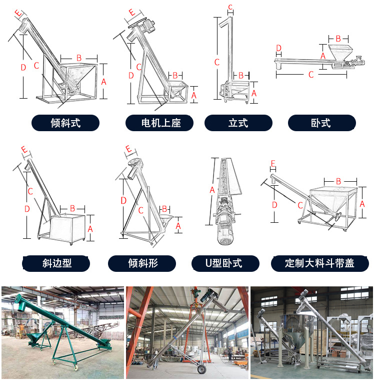 答斜式螺旋上料機適合清洗輸送物料,比較占位置,穩定性沒有那么好,垂直的螺旋上料機用于垂直輸送,性價比高些,四腳加有腳輪,方便移動,一機可以配多臺機