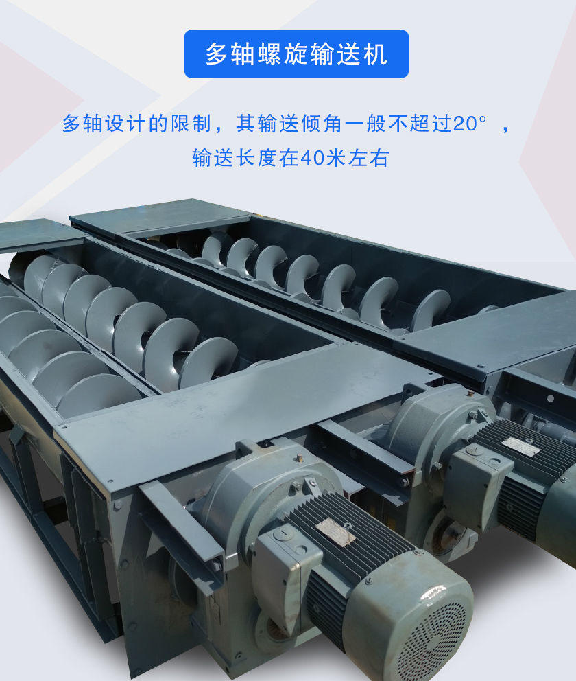 多軸螺旋輸送機采用2根以上螺旋軸,與單軸螺旋輸送機相比具備攪拌作用,輸送傾角一般不超過20°,輸送距離在40米左右.多軸螺旋輸送機采用封閉式輸送,無粉塵污染.