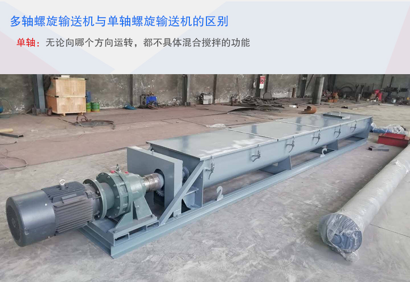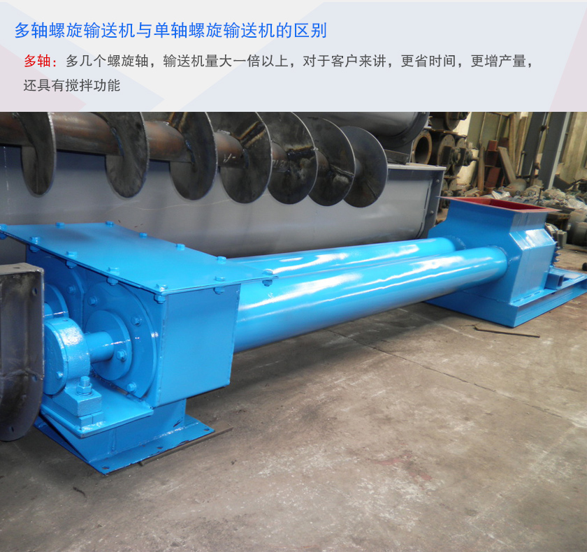 多軸螺旋輸送機與單軸螺旋輸送機相比多幾個螺旋軸,輸送機量大一倍以上,對于客戶來講,更省時間,更增產(chǎn)量,還具有攪拌功能,單軸螺旋輸送機無論向哪個方向運轉(zhuǎn),都不具體混合攪拌的功能,而多軸螺旋輸送機則是兩邊螺旋軸轉(zhuǎn)向不同的方向(注:都向內(nèi)側(cè)轉(zhuǎn)動)。所以當(dāng)物料放入進料口時,會自動將物料轉(zhuǎn)動到中間,混合到一起。