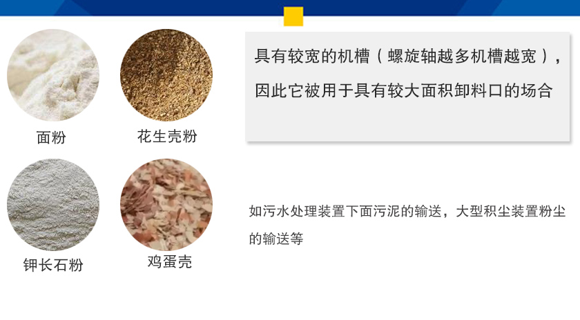 多軸螺旋輸送機具有較寬的機槽(螺旋軸越多機槽越寬),因此它被用于具有較大面積卸料口的場合,如污水處理裝置下面污泥的輸送,大型積塵裝置粉塵的輸送等,如:面粉、花生殼粉,玉米粉,鉀長石粉,雞蛋殼等等。